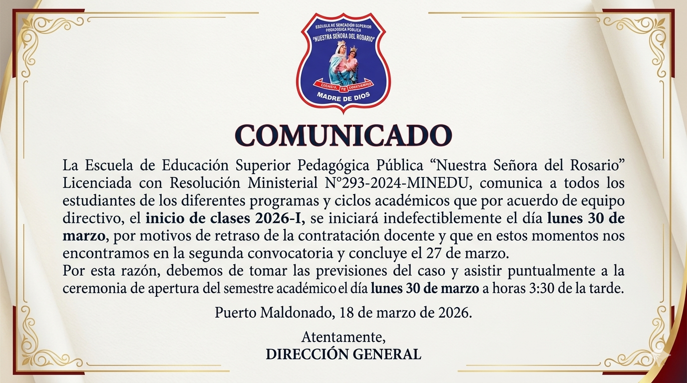 Se comunica a los docentes que desean participar en el concurso público de contratación de Docente Regular en plazas orgánicas, de reemplazo y bolsa de horas de 40 horas a tiempo completo para el año académico 2026, en la Escuela de Educación Superior Pedagógica Pública “Nuestra Señora del Rosario”, que todos los postulantes deben realizar…